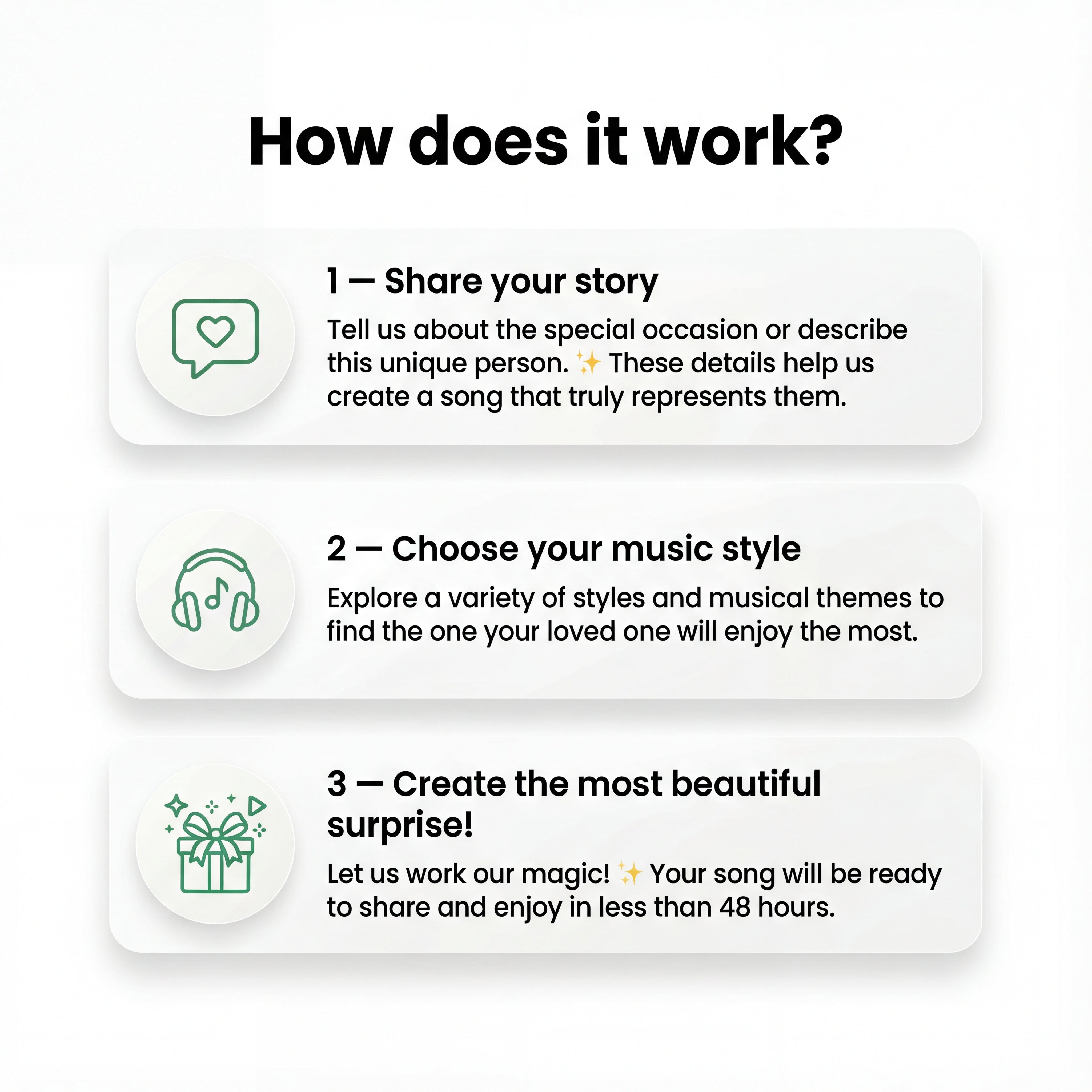 Tell us what makes your story unique – and we’ll turn it into a song that captures every emotion.